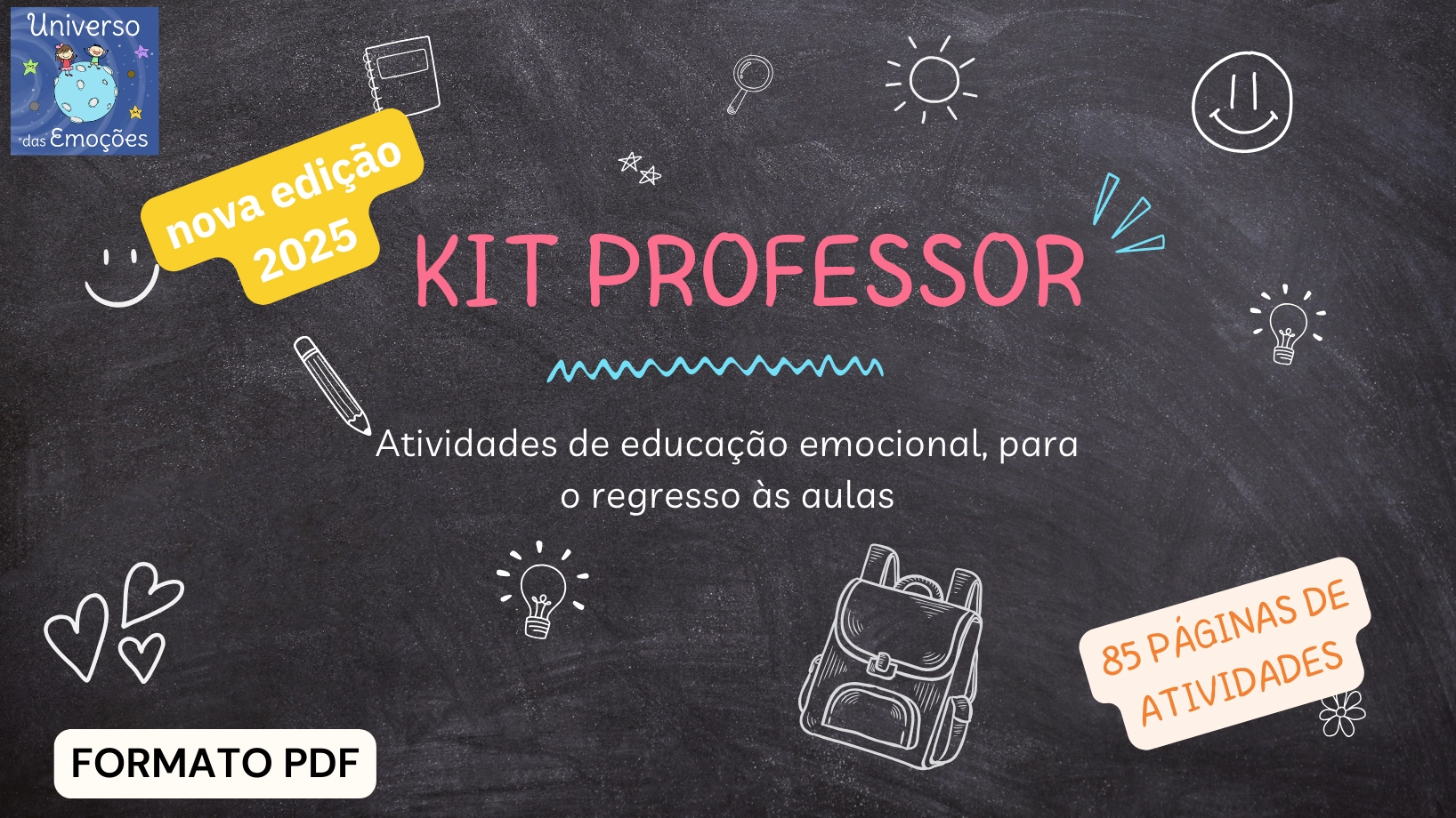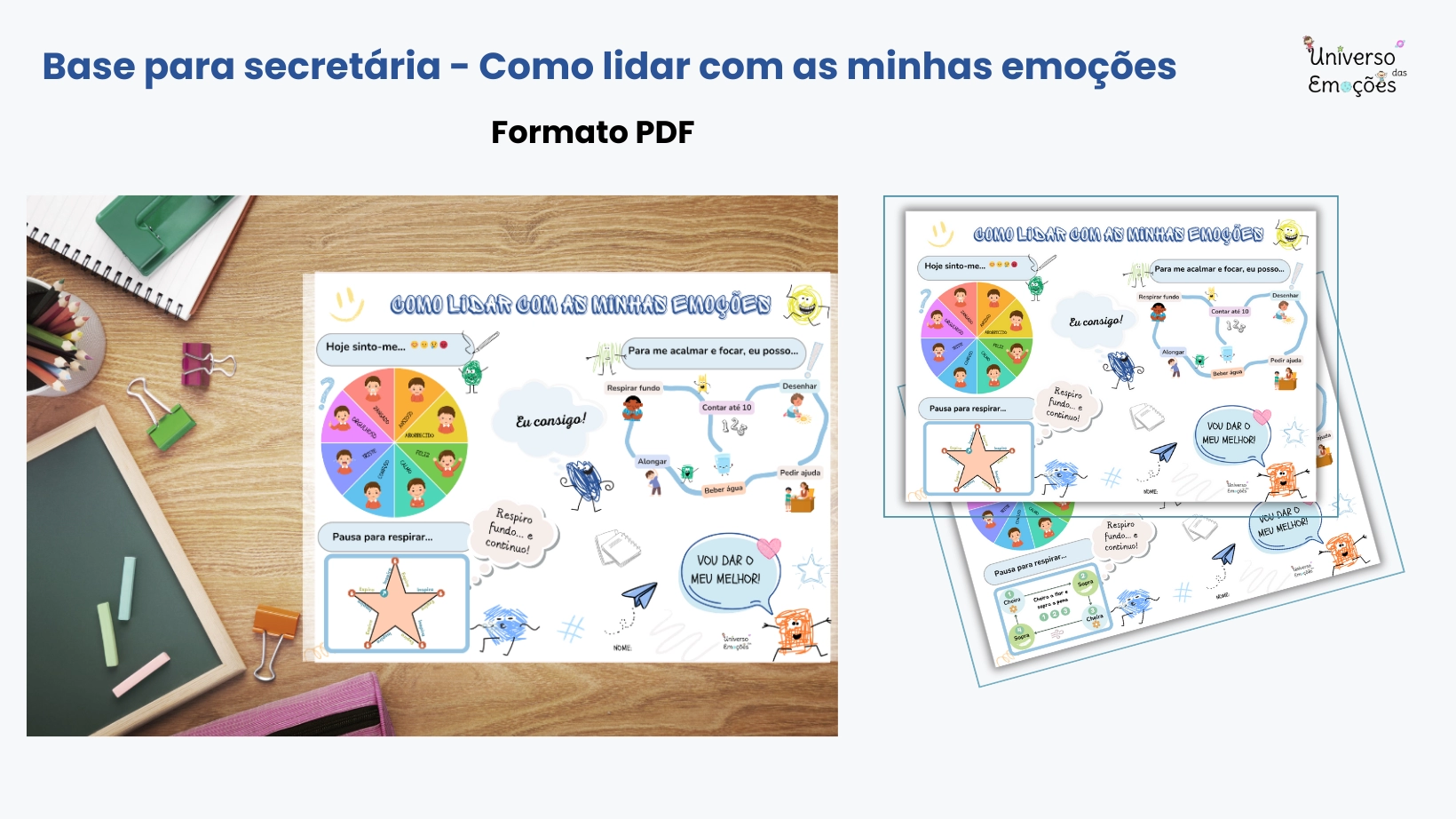 Kit composto por recursos em formato PDF (materiais, fichas de atividades, posters) de educação emocional, para descarregar e imprimir, para ser usado em sala de aula com os alunos.